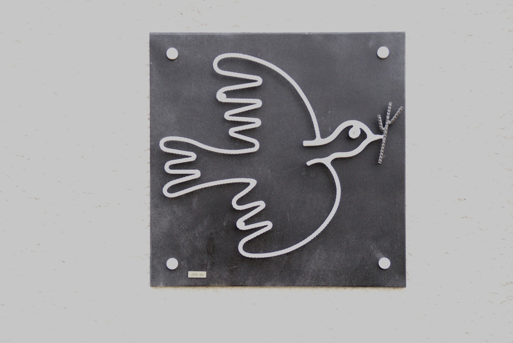 Colombe de la paix blanche, fixée sur panneau en contreplaqué marine peint en gris imitation ardoise. Partant vers la gauche.